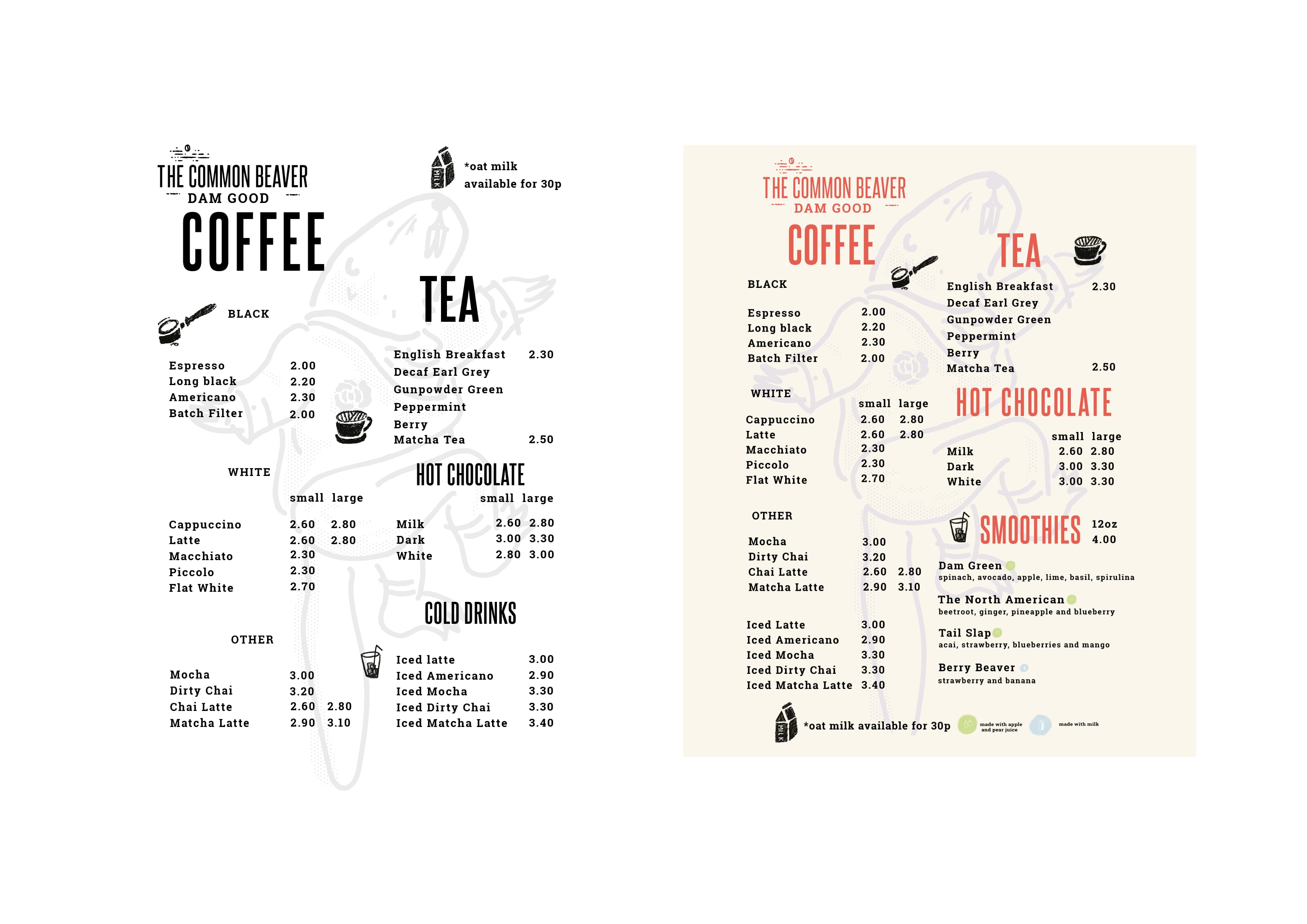 Exeter based independant coffee shop The Common Beaver, comissioned me to do their menu, packaging and photography.